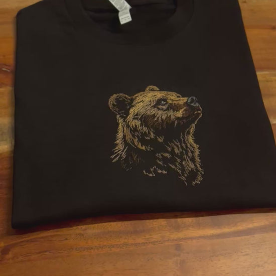 Bring a touch of the wild to your everyday style with this embroidered bear T-shirt. This classic black tee features a detailed brown bear embroidery on the chest — a striking design that captures both strength and calm. The intricate stitching adds texture and depth, making it a standout piece!
